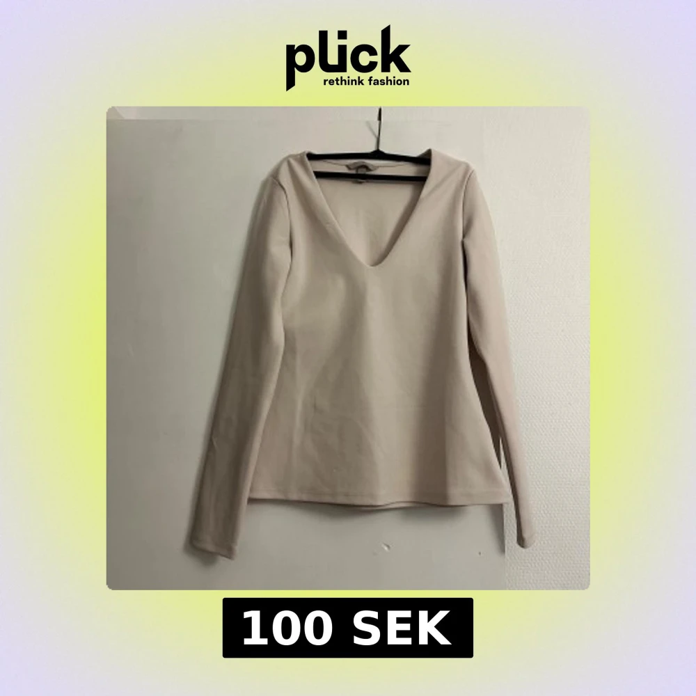 Säljer en stilren beige långärmad topp från H&M med djup v-ringning. Toppen har en enkel och clean design, perfekt att matcha med jeans eller kjol. Mjuk och stretchig känsla i materialet för en bekväm passform.