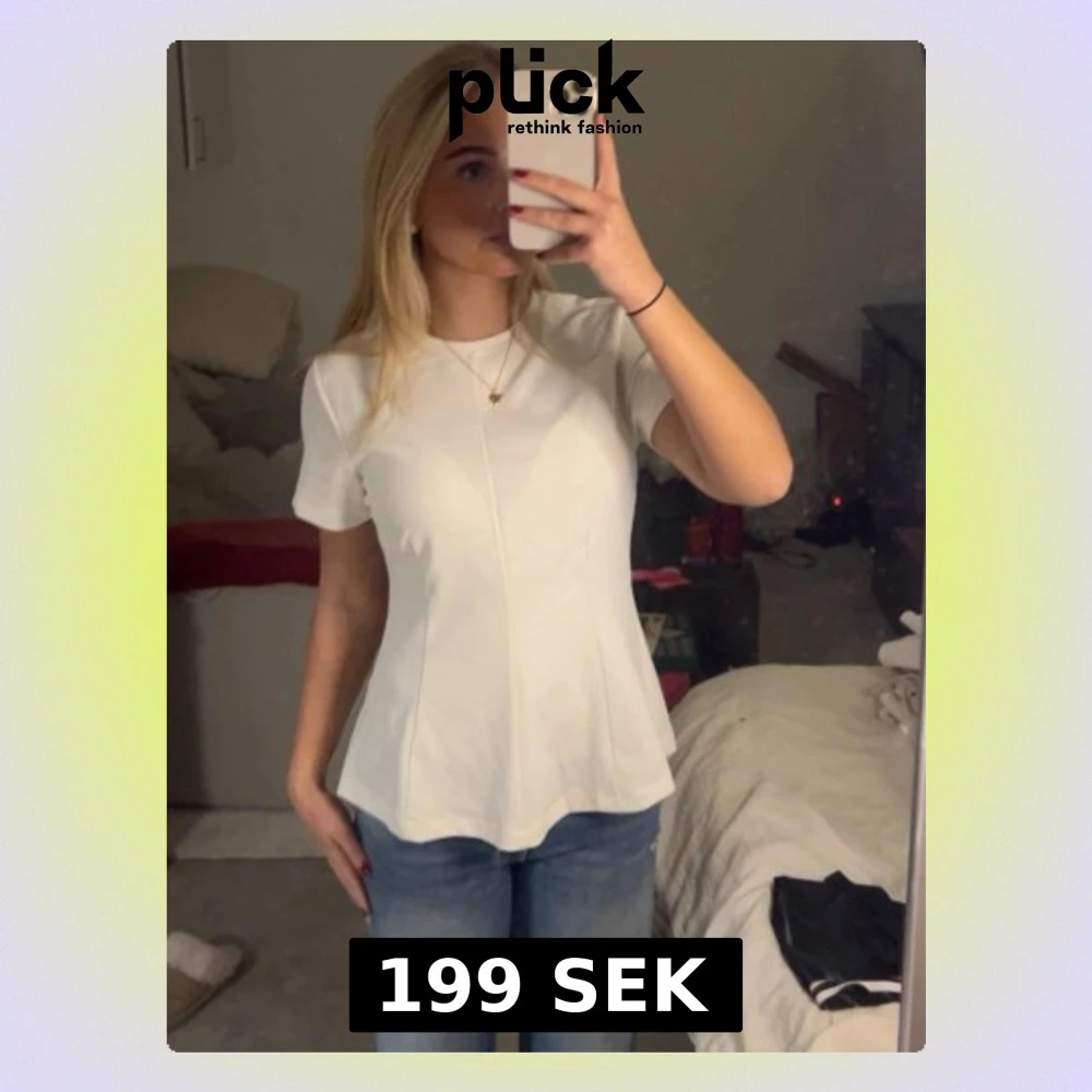 Säljer en stilren vit blus från H&M i storlek S. Toppen har korta ärmar, rund hals och markerad midja som ger en snygg siluett. Materialet känns mjukt och har en lätt stretch. Perfekt för dig som gillar enkla och fräscha looks.