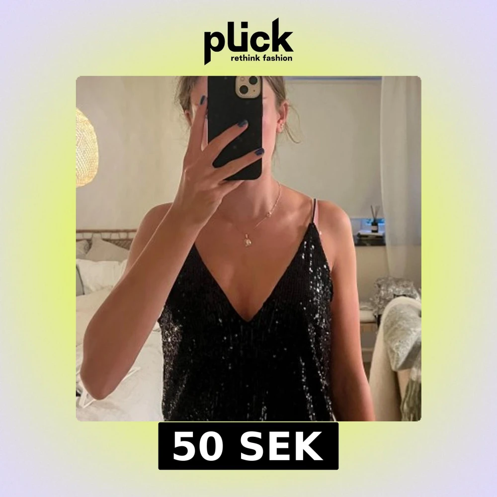 Supersnyggt svart linne från H&M med tunna axelband och v-ringning. Hela toppen är täckt av glittriga paljetter som ger en riktigt festlig vibe. Tillverkad i polyester och elastan för en bekväm passform. Perfekt för att sticka ut på nästa utekväll!