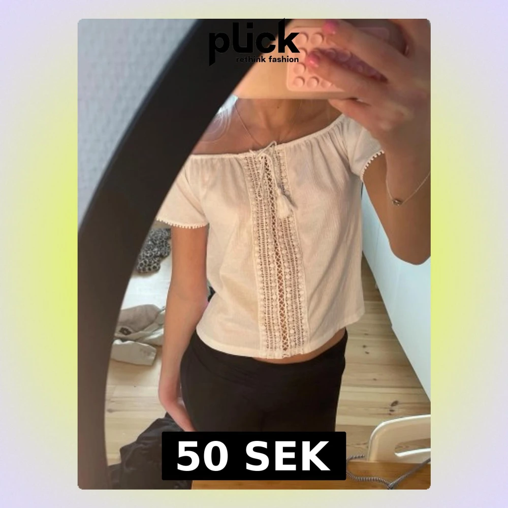Superfin vit offshoulder blus med spets och knyt framtill. Blusen har korta ärmar med små bollar i kanten och är gjord i ett lätt bomullstyg. Perfekt för varma dagar och ger en romantisk vibe.