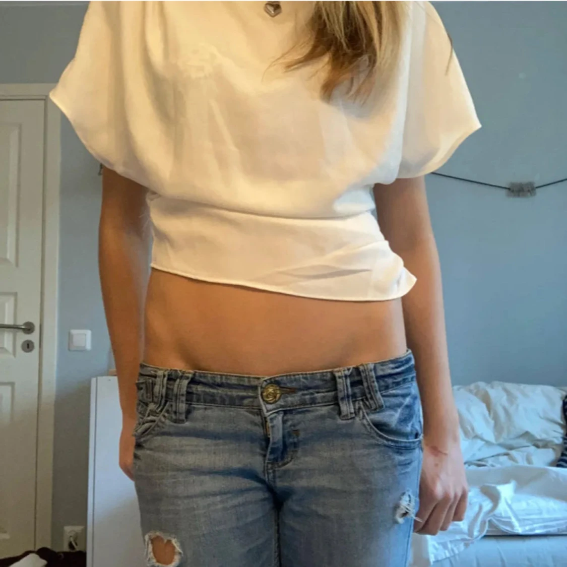 Säljer en stilren vit blus med croppad passform och korta ärmar. Toppen har en enkel och clean look med lätt glansigt tyg som ger en fräsch känsla. Perfekt att matcha med jeans eller kjol för en trendig outfit.