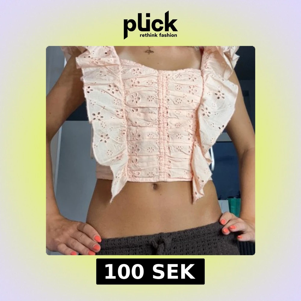 Supersöt ljusrosa blus med broderade blommor och stora volanger längs axlarna från H&M. Croppad modell med smockad front och fyrkantig ringning. Perfekt för sommarens alla tillfällen när du vill sticka ut lite extra.