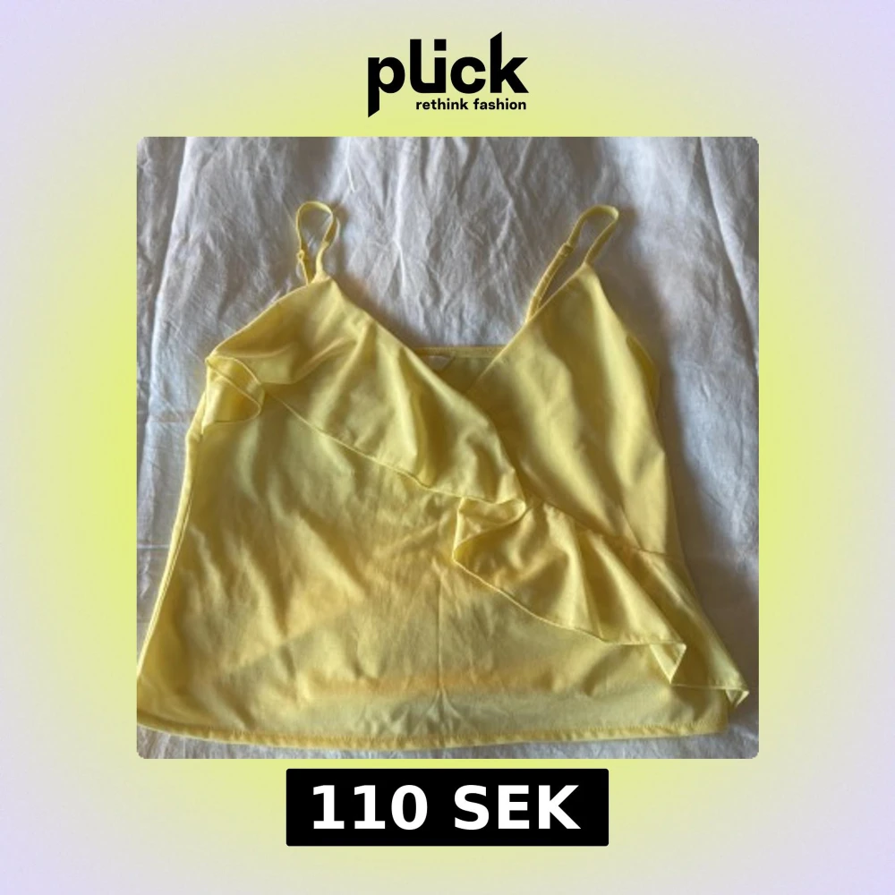 Snygg gul linnetopp från H&M med smala axelband och volangdetalj framtill. Toppen har v-ringning och är tillverkad i ett mjukt, lätt material som känns skönt mot huden. Perfekt för soliga dagar och somriga outfits.