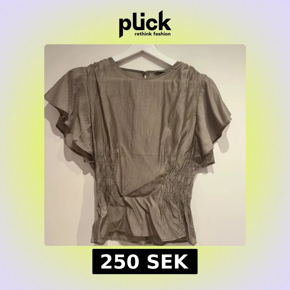 Säljer en elegant beige blus med korta ärmar och rynkade detaljer i midjan. Blusen har en rund hals och en diskret knäppning i ryggen. Perfekt för en stilren look.