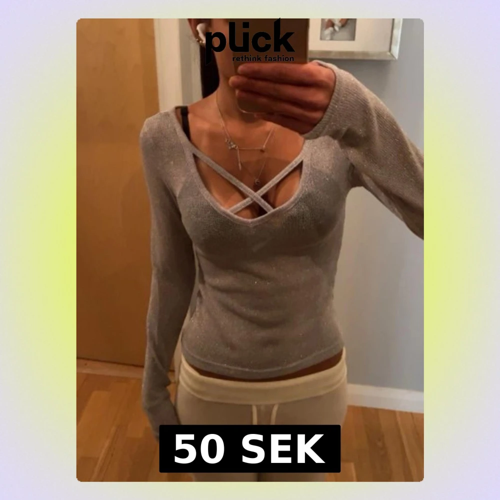 Säljer en glittrig silverfärgad långärmad topp med djup v-ringning och dekorativa band över bröstet. Toppen har en tight passform och är tillverkad i ett stretchigt syntetmaterial som ger en snygg glansig effekt.