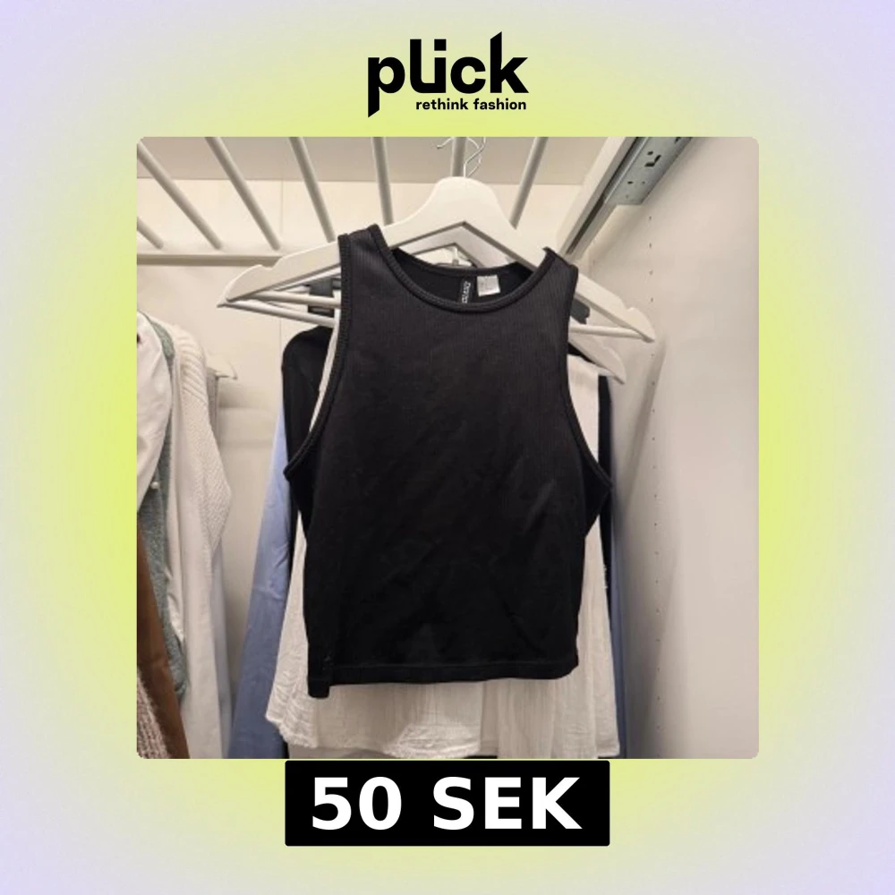 Svart croppad linnetopp från H&M med ribbad struktur. Toppen är ärmlös och har en rundad halsringning. Perfekt för att styla med jeans eller kjol för en clean och enkel look.