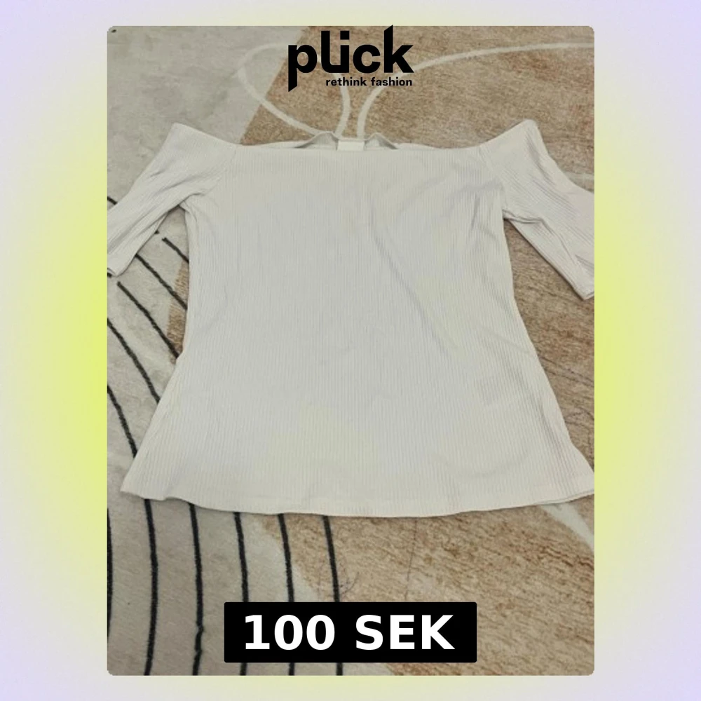 Säljer en vit ribbad topp med offshoulder-design och trekvartsärm. Toppen har en stilren och enkel look med smal ribbad struktur i tyget, perfekt för att skapa en fräsch och modern outfit.
