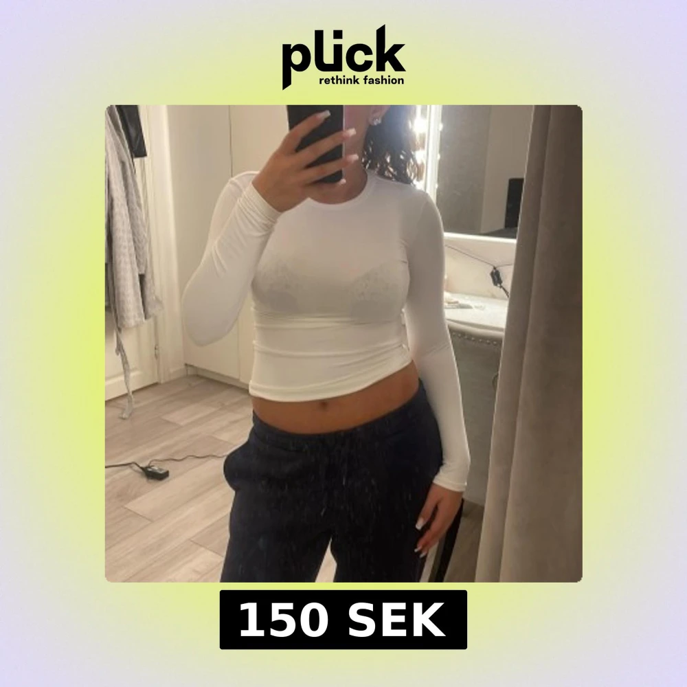 Säljer en vit långärmad topp från H&M i storlek S. Modellen är croppad med rund hals och har en tight passform. Materialet är mjukt och stretchigt polyester som sitter snyggt mot kroppen. Perfekt att styla med jeans eller mjukisbyxor för en clean look.