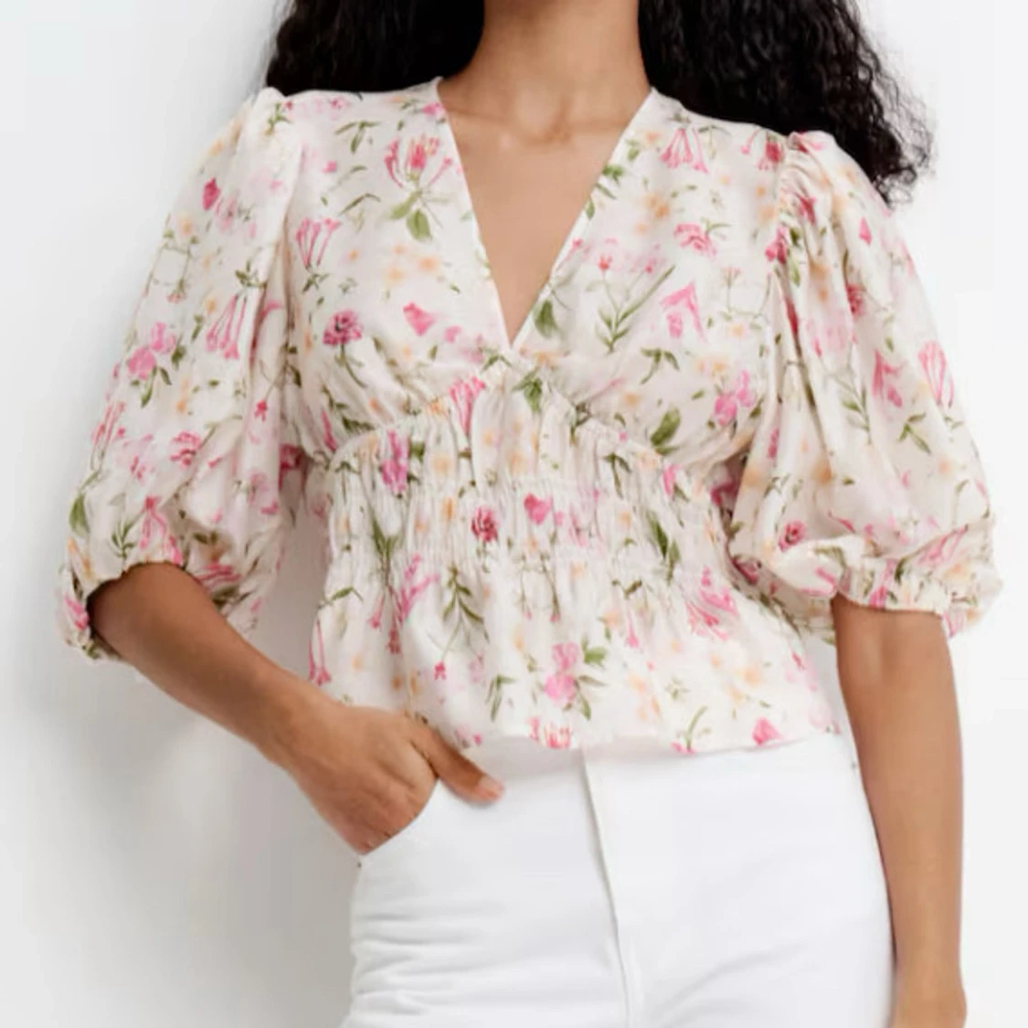 Superfin blommig blus i vitt med rosa och gröna detaljer. Blusen har v-ringning, puffiga trekvartsärmar och smockad midja som ger en snygg siluett. Perfekt för vår och sommar!