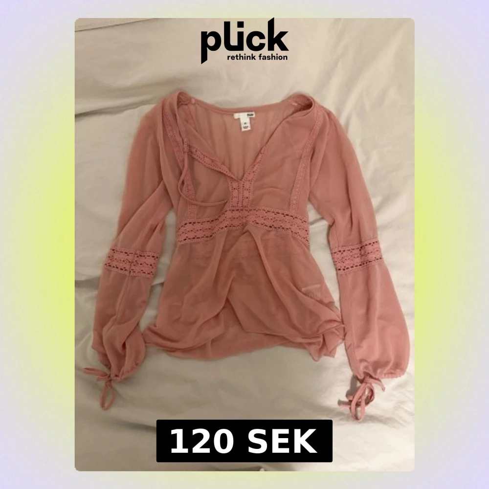 Säljer eb rosa omlottopp från H&M med v-ringning och spetsdetaljer. Toppen har långa ärmar med knyt vid handlederna och är tillverkad i ett tunt, genomskinligt material som ger en luftig känsla. Perfekt för dig som gillar feminina och trendiga plagg.