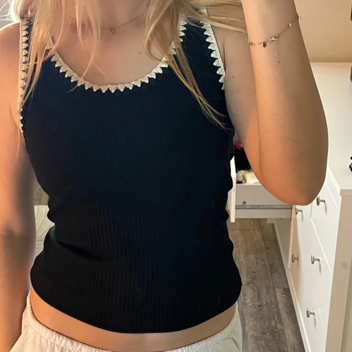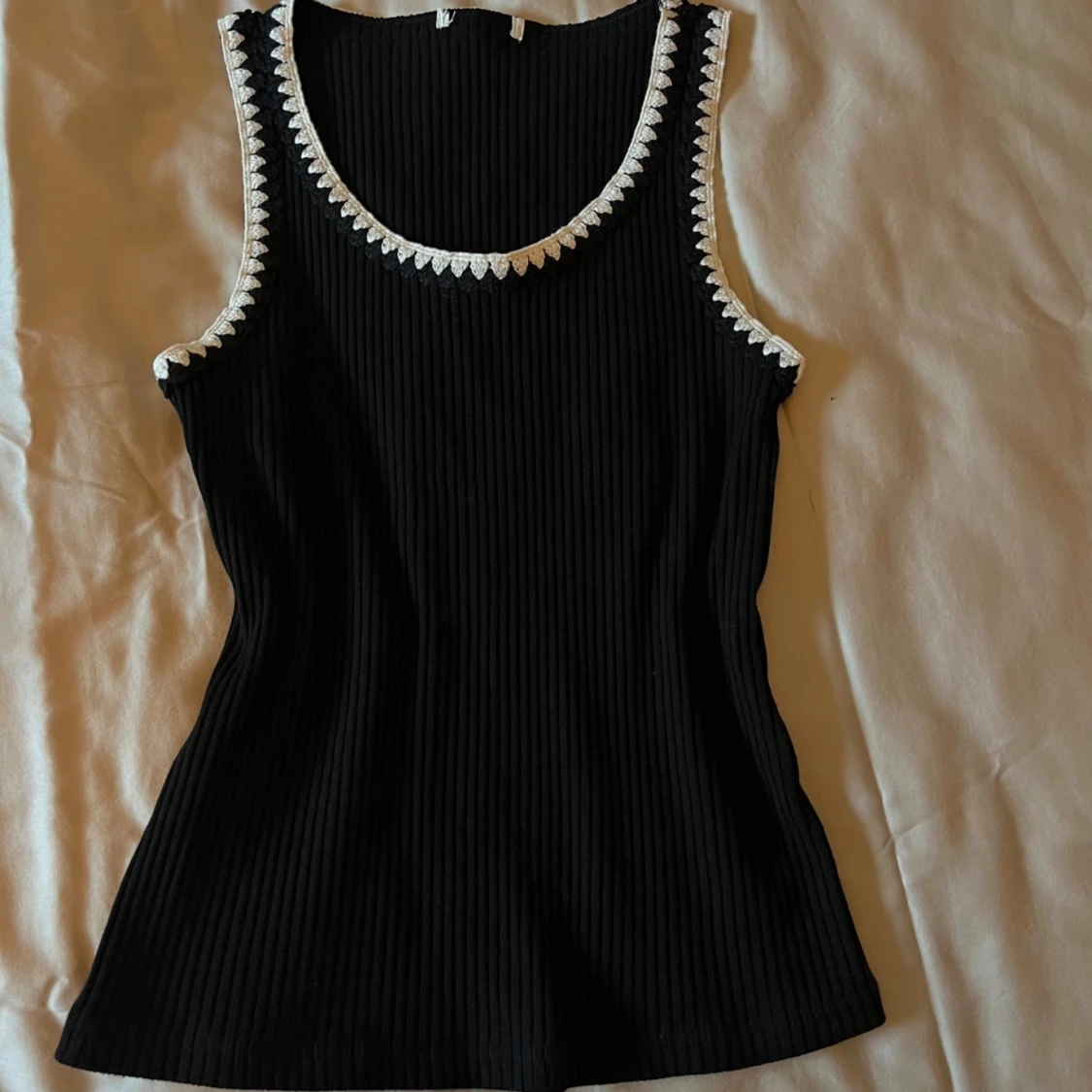 Snygg svart ribbad linnetopp med vit broderad kant runt halsringning och ärmhål. Perfekt för en stilren look.