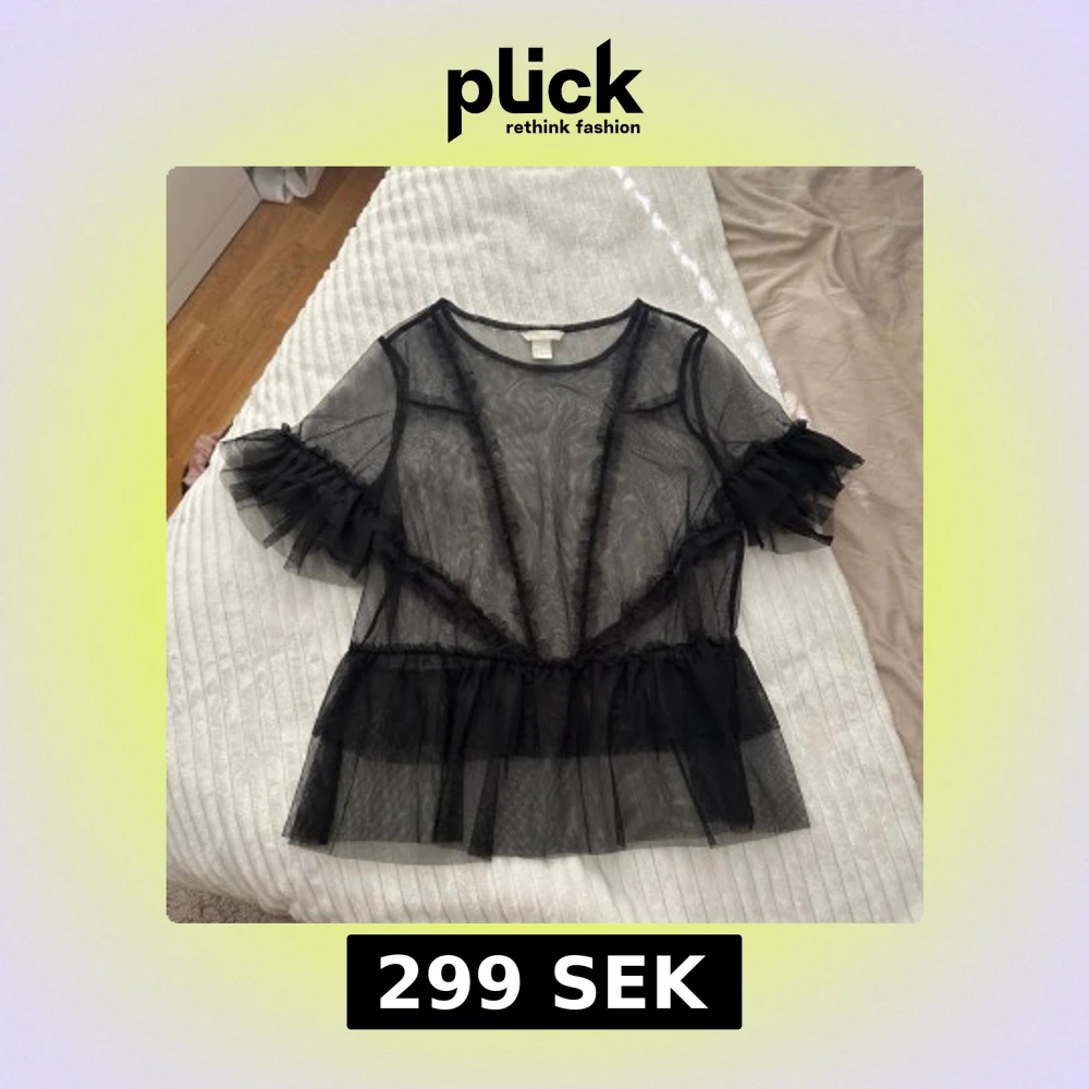 Säljer en svart transparent meshblus från H&M i storlek S. Blusen har korta ärmar med volangdetaljer och volanger längs fram- och baksidan samt nederkant. Perfekt för att skapa en cool lager-på-lager look eller för att sticka ut med edgy vibes.