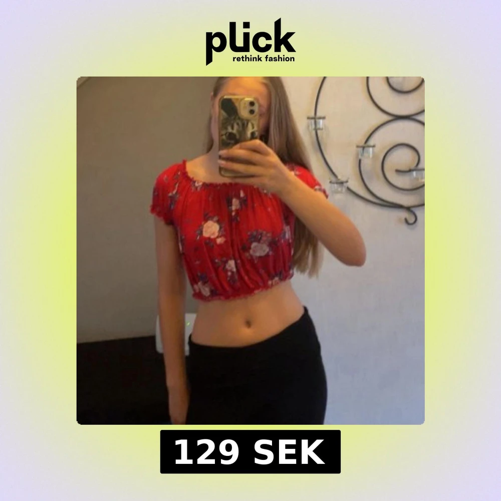 Superfin röd croppad topp från H&M med blommigt mönster och korta puffärmar. Toppen har resår vid axlar och midja för en söt offshoulder-look. Perfekt för varma dagar och ger en riktigt somrig vibe!❤️