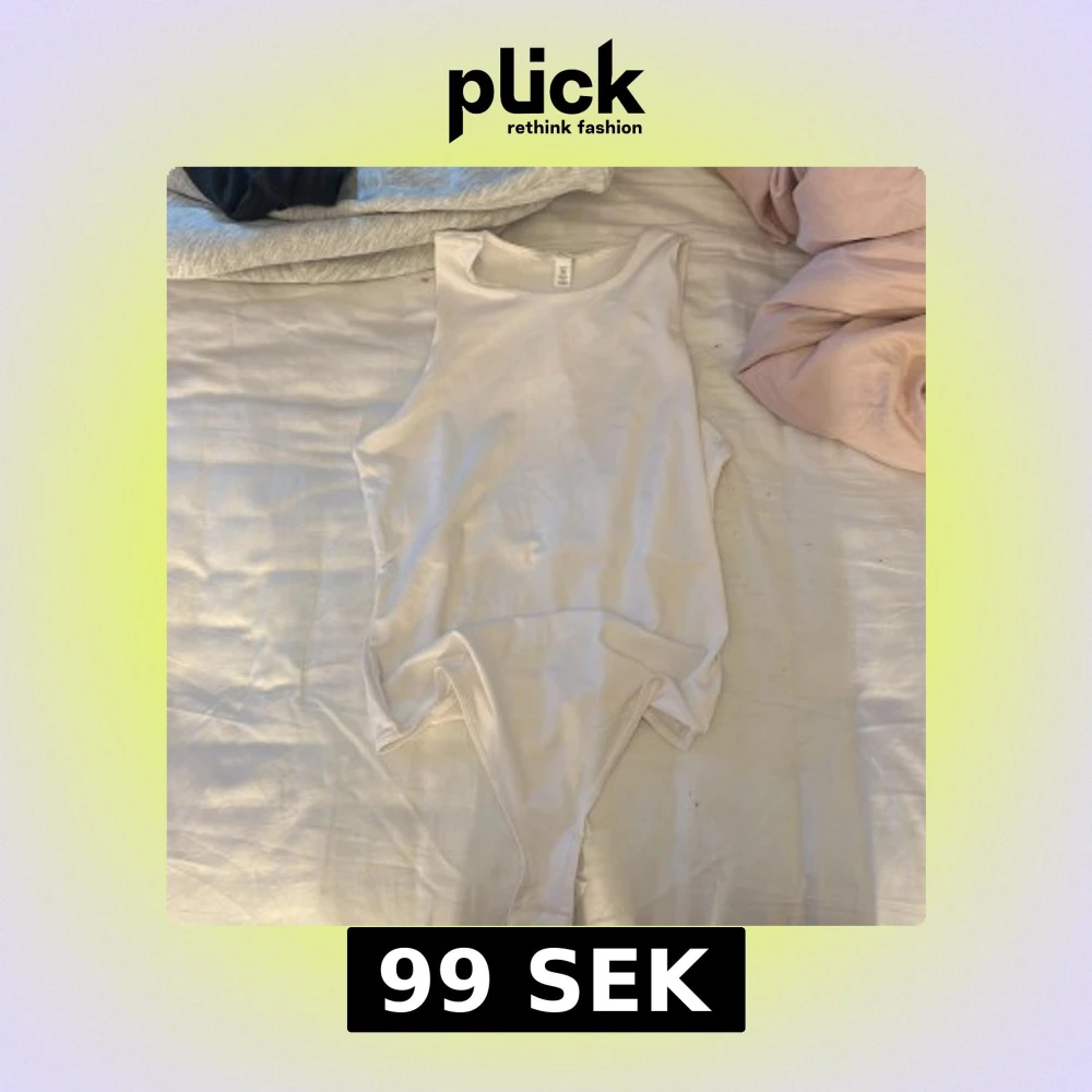 Säljer en stilren vit bodysuit från H&M i storlek S. Modellen är ärmlös med rund halsringning och har en slät, enkel design. Materialet känns mjukt och stretchigt, perfekt för att matcha med jeans eller kjol. Passformen är tight och figurnära.