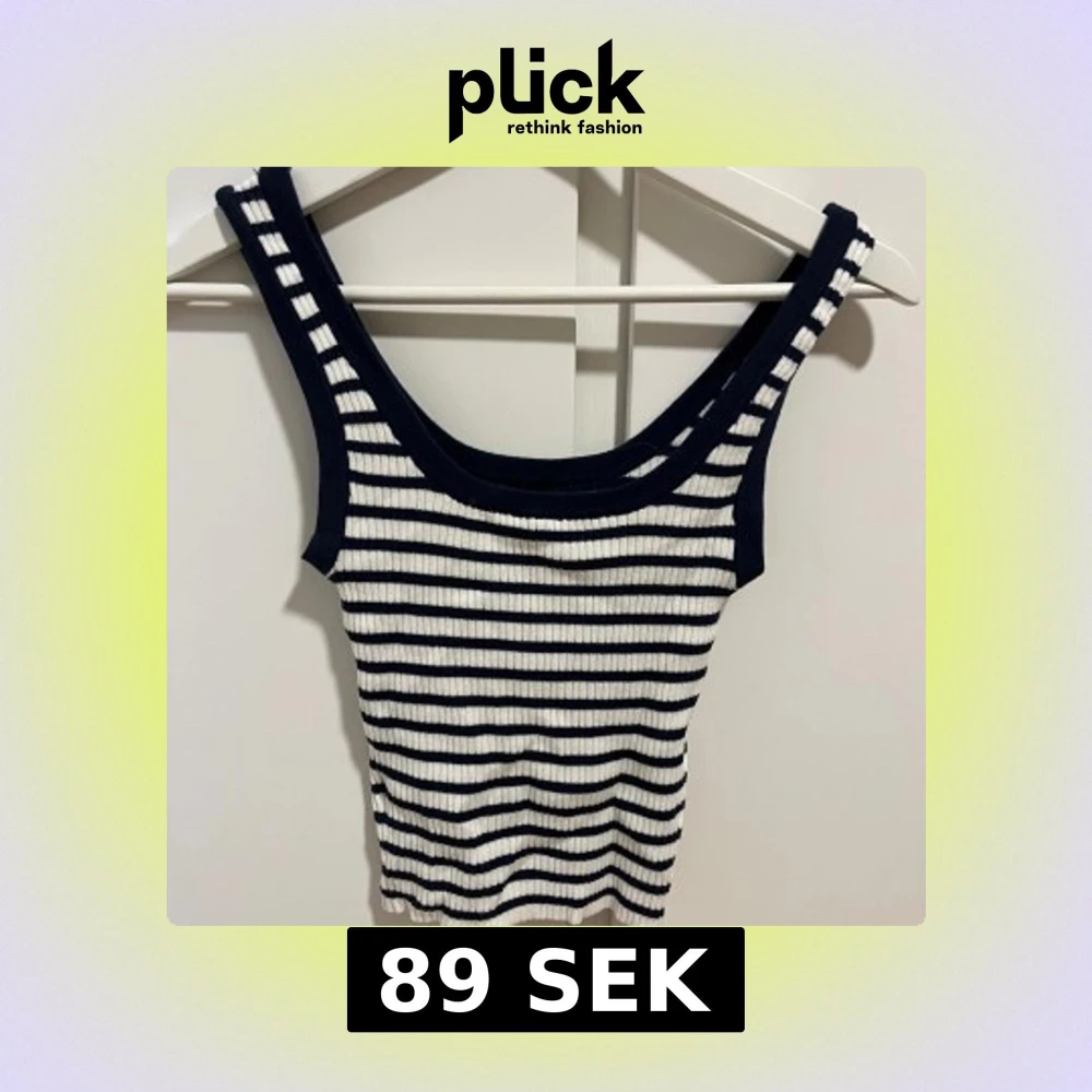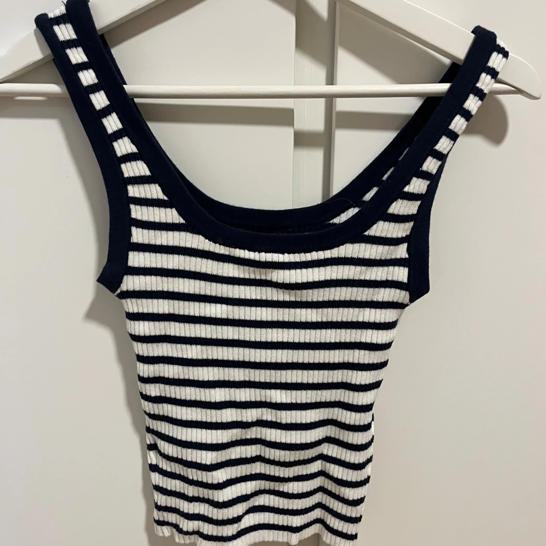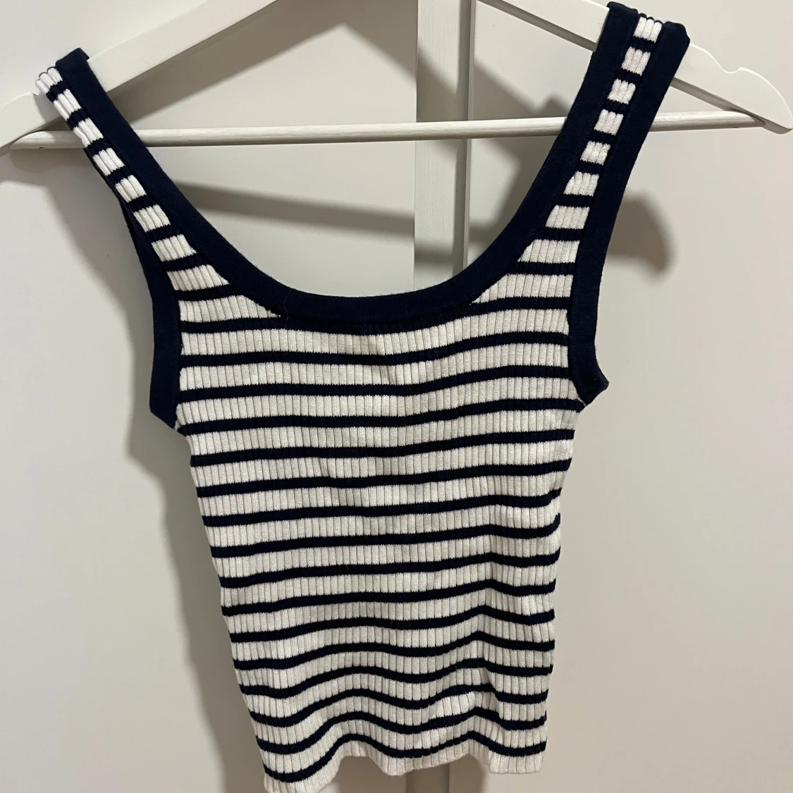 Snygg randig linnetopp i blå och vit med ribbad struktur. Perfekt för sommardagar med sin ärmlösa design och bekväma passform.