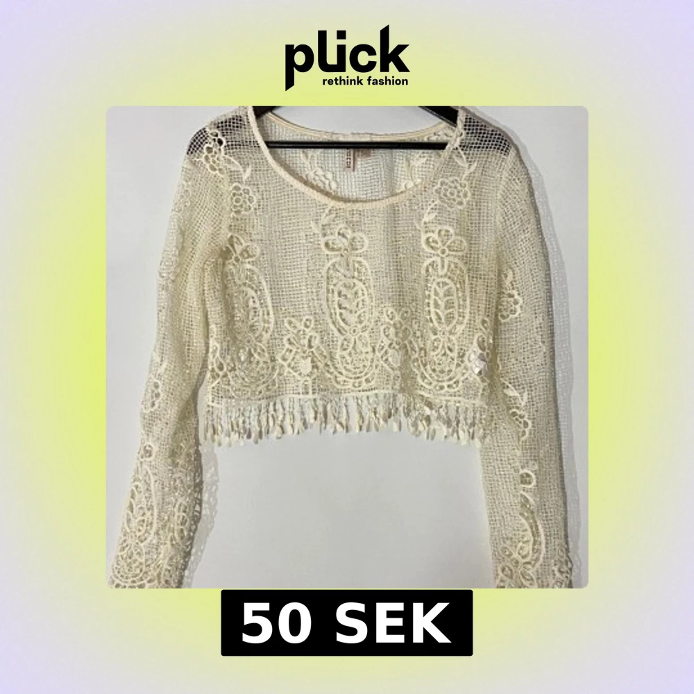 Superfin cremvit croppad blus med spets och broderade blommor. Långärmad modell med transparent känsla och snygga fransar längs nederkanten. Perfekt för dig som vill sticka ut med en romantisk och bohemisk vibe.