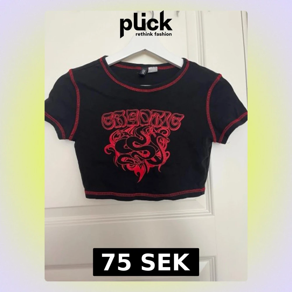 Svart croppad topp med röda kontrastsömmar och tryck framtill med texten 'CHAOTIC' och en röd orm med flera huvuden. T-shirten har korta ärmar och en edgy vibe, perfekt för dig som gillar statement-plagg.