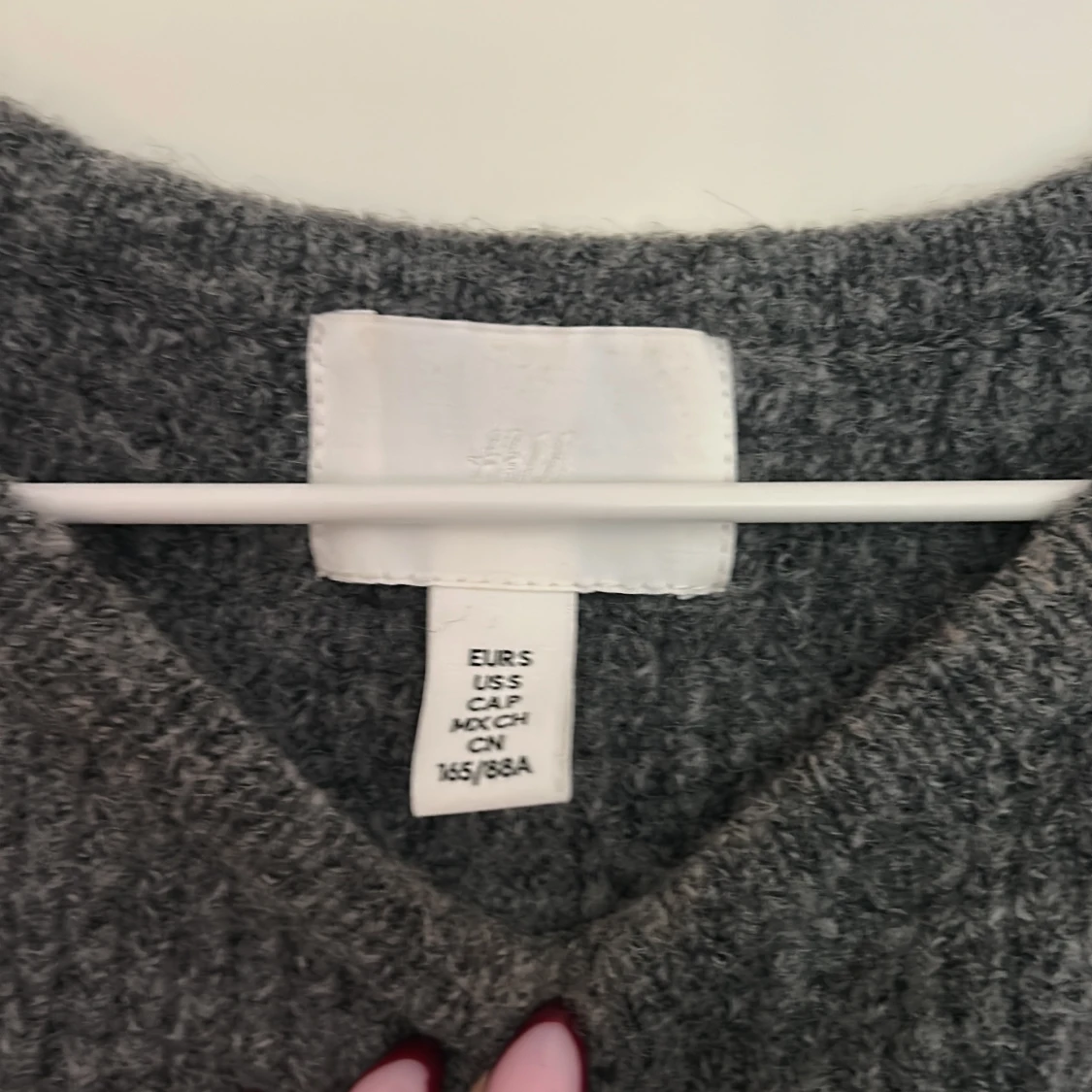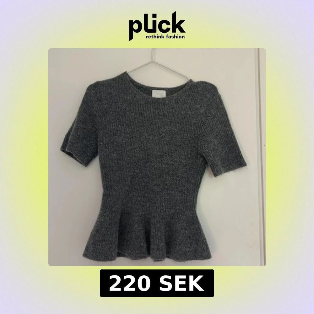 Säljer en grå stickad topp från H&M i storlek S. Toppen har korta ärmar, rund hals och en peplumformad nederdel som ger en snygg siluett. Perfekt för dig som gillar mjuka material och enkel stil med en twist.