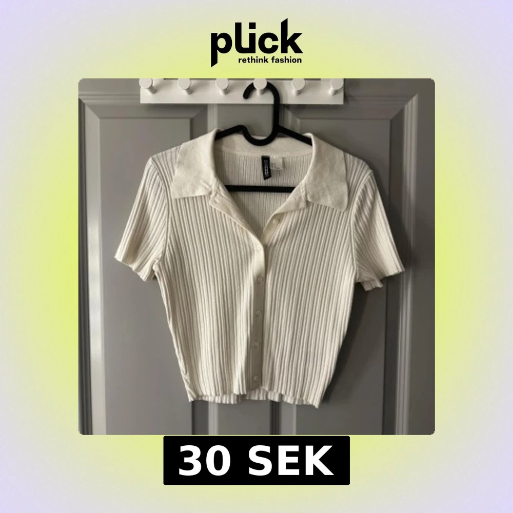 Säljer en stilren vit ribbad blus från H&M med korta ärmar och knappar framtill. Den har en klassisk krage och är i en mjuk och bekväm kvalitet.