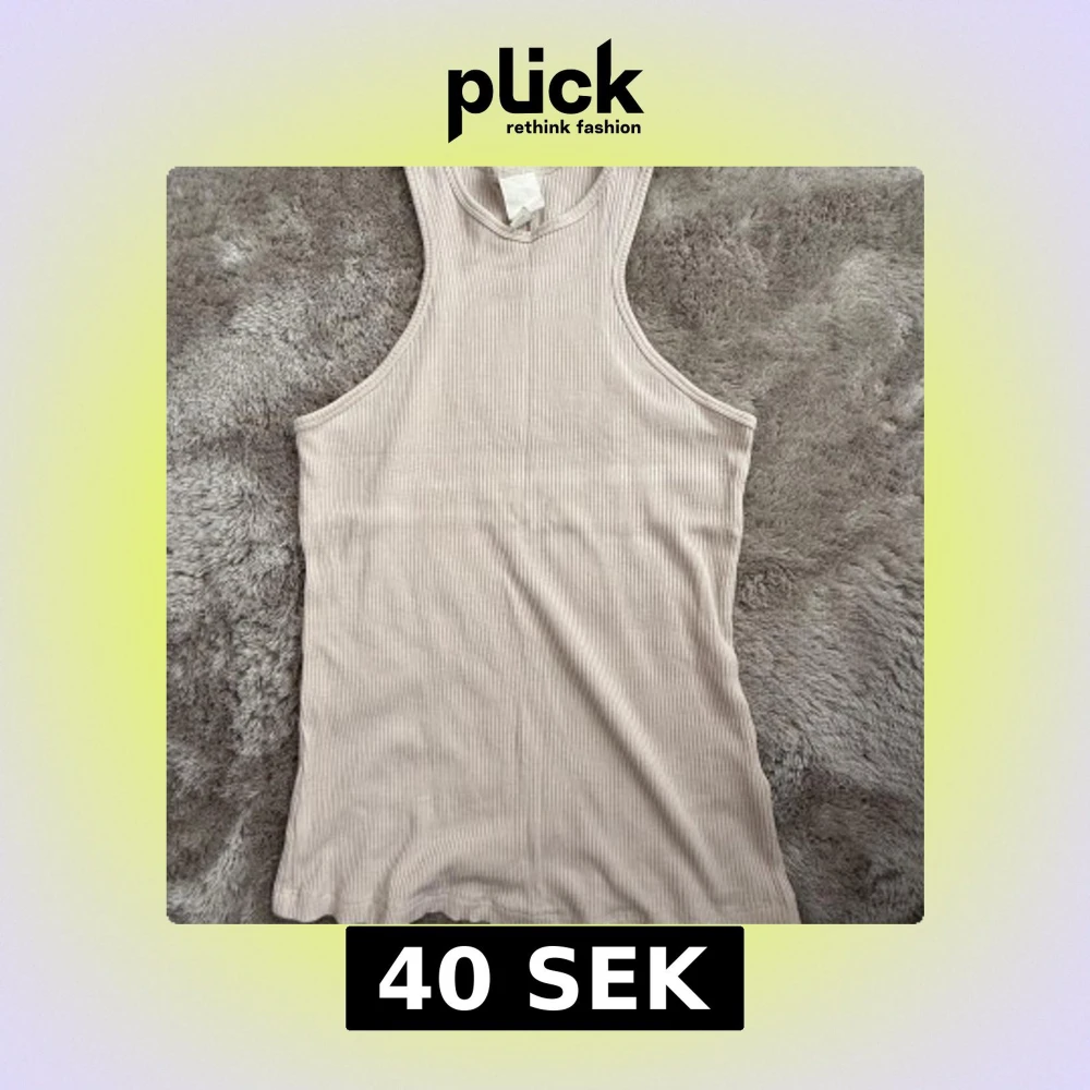 Snygg beige ribbad linnetopp med rund halsringning och ärmlös design.