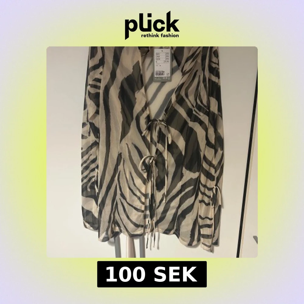 Säljer en transparent zebramönstrad blus från H&M i svart och beige. Blusen har v-ringning, långa ärmar och snygga knytband framtill och vid ärmsluten. Tillverkad i luftig polyester, perfekt för att sticka ut med ett coolt mönster.