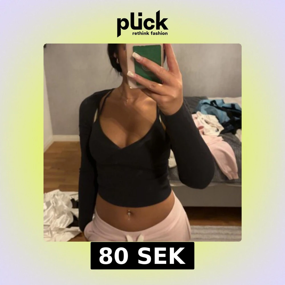 Säljer en svart croppad topp med lång ärm och v-ringad hals. Snygg och tight passform som framhäver figuren. Perfekt att styla med jeans eller kjol för en trendig look. Materialet känns mjukt och stretchigt mot huden.