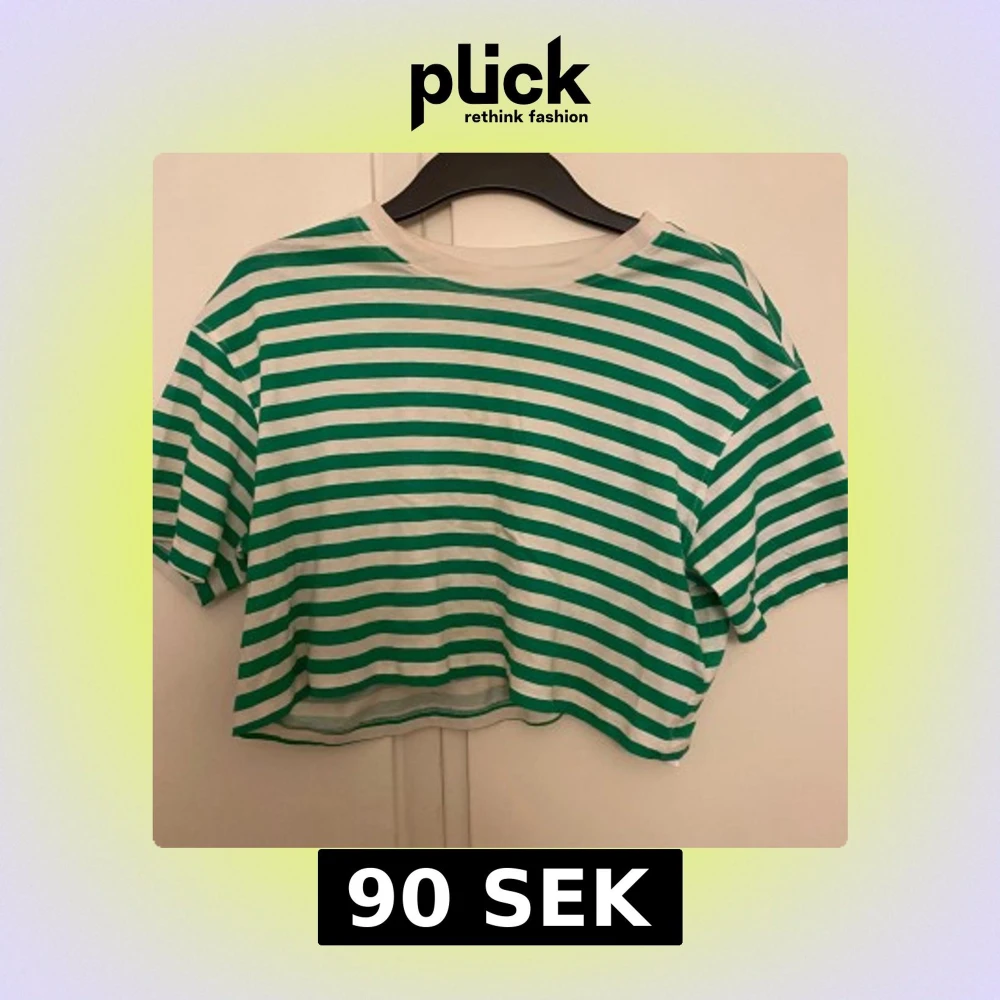 Säljer en croppad topp med gröna och vita horisontella ränder. T-shirten har korta ärmar, rund halsringning och är gjord i mjuk bomull. Perfekt för en chill och trendig look.
