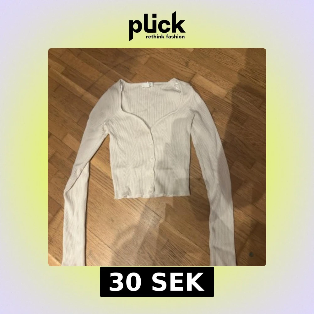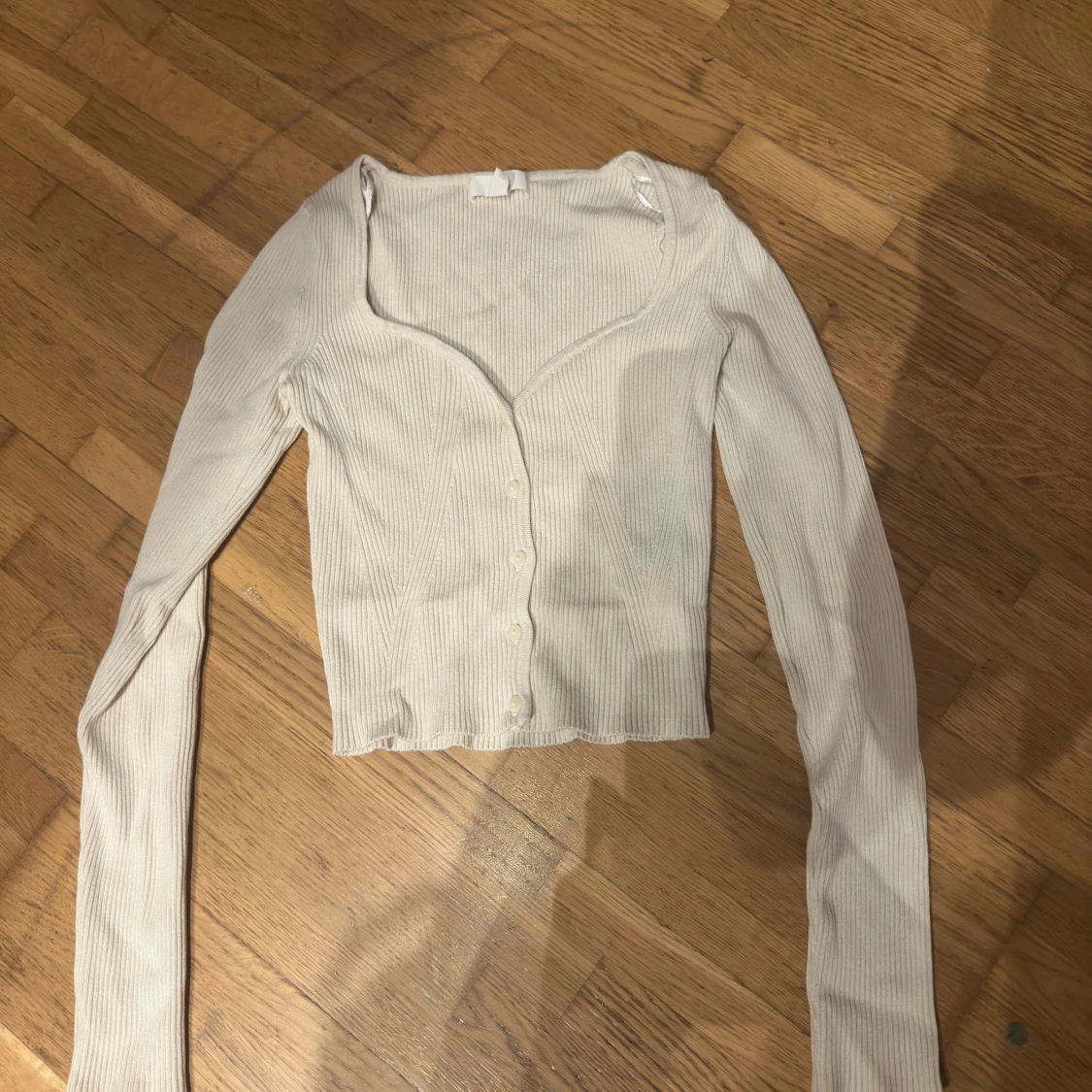 Säljer en stilren vit ribbad topp med långa ärmar och knappar framtill. Perfekt för lager-på-lager eller som den är. Passar till många olika outfits!