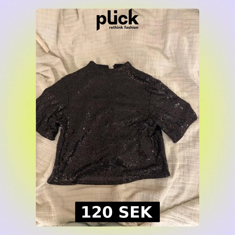 Säljer en svart topp täckt av glittrande paljetter. Modellen är croppad med korta ärmar och hög hals. Perfekt för dig som vill sticka ut med en riktigt snygg och glittrig look. Toppen har en rak passform och stängs med dragkedja i nacken.