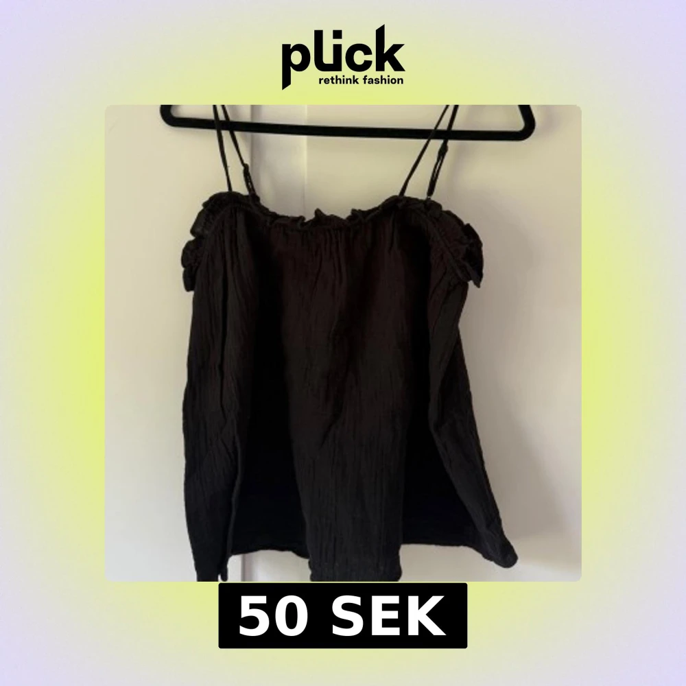 Säljer en svart linnetopp med tunna axelband och rynkad kant upptill. Toppen har en luftig och avslappnad passform, perfekt för varma dagar. Materialet är mjukt och har en lätt struktur som ger en cool vibe.