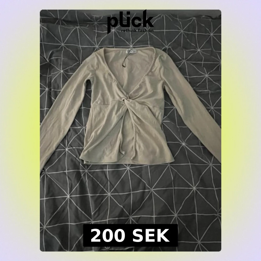 Säljer en beige omlottopp från H&M med lång ärm och snygg knytning framtill. Toppen har v-ringad urringning och är tillverkad i mjukt, stretchigt material som sitter skönt på kroppen. Perfekt att styla med jeans eller kjol för en trendig look.