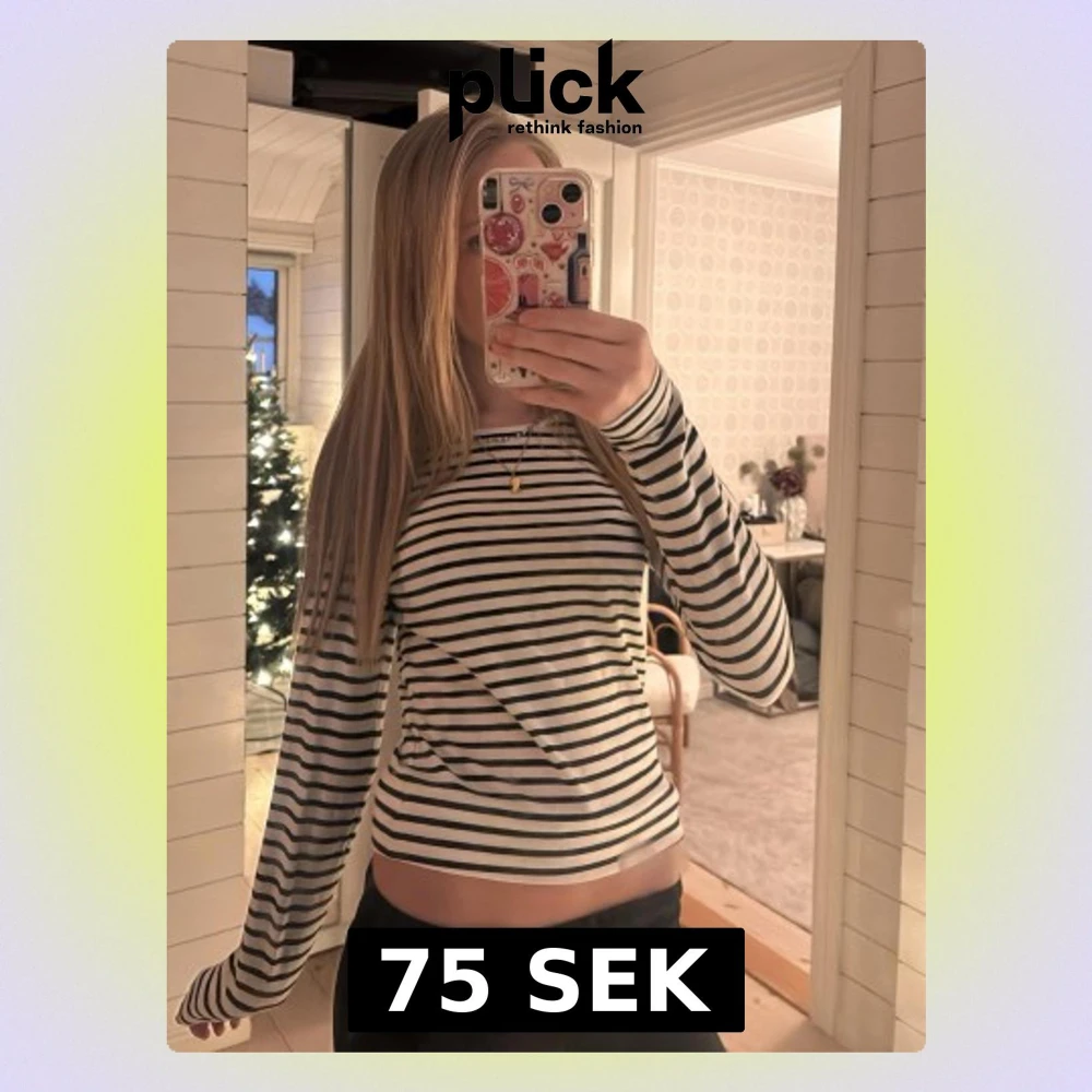 Säljer en långärmad topp med svartvita ränder. Toppen har en klassisk rund halsringning och är gjord i mjuk bomull som känns skön mot huden. Passformen är normal och modellen är enkel men stilren, perfekt till jeans eller kjol.