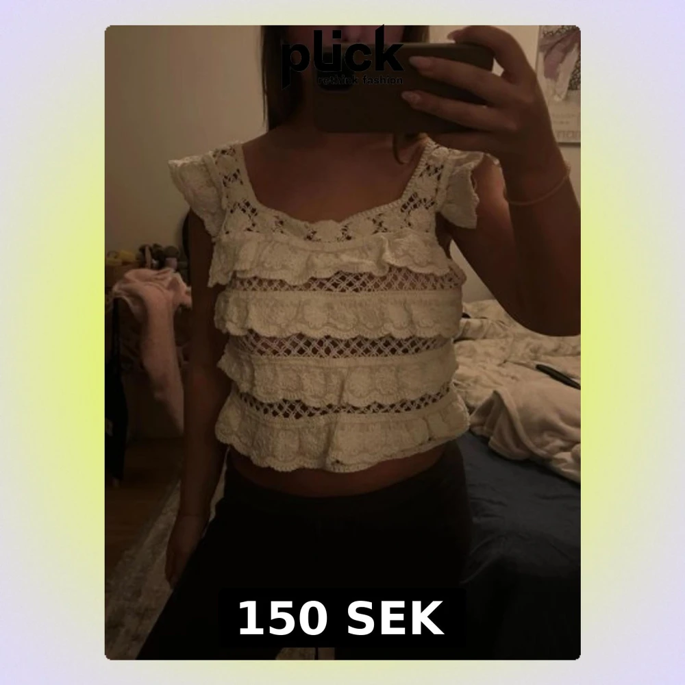 Säljer en superfin vit blus i spets med flera lager volanger och genombrutet mönster. Toppen kan bäras både på axlarna och offshoulder för olika looks. Den har korta volangärmar och är croppad i modellen. Perfekt för dig som gillar romantisk och bohemisk stil.
