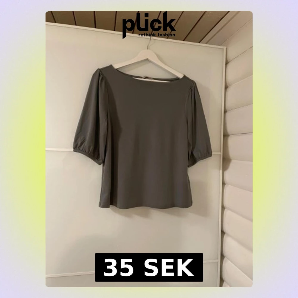 Säljer en stilren grå blus från H&M i storlek S. Blusen har rund halsringning och lite puffiga trekvartsärmar. Materialet känns mjukt och har ett snyggt fall. Perfekt att matcha med jeans eller kjol eller som baslager i en outfit✨😊
