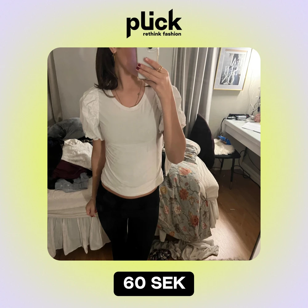 Säljer en stilren vit topp med korta puffärmar. Perfekt för en chic och enkel look. Passar bra till både jeans och kjol. Hör av dig vid intresse!