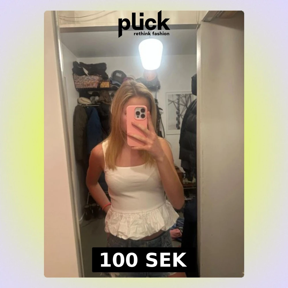 Säljer en söt vit topp med fyrkantig ringning och volang nertill. Toppen är ärmlös och har en croppad passform. Säljer pga att den inte kommer till användning.