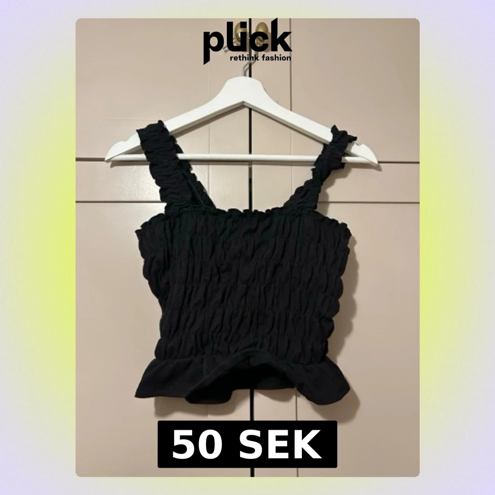 Trendig svart linnetopp med smockad struktur och breda axelband. Toppen har en lätt volang nertill. aldrig använd
