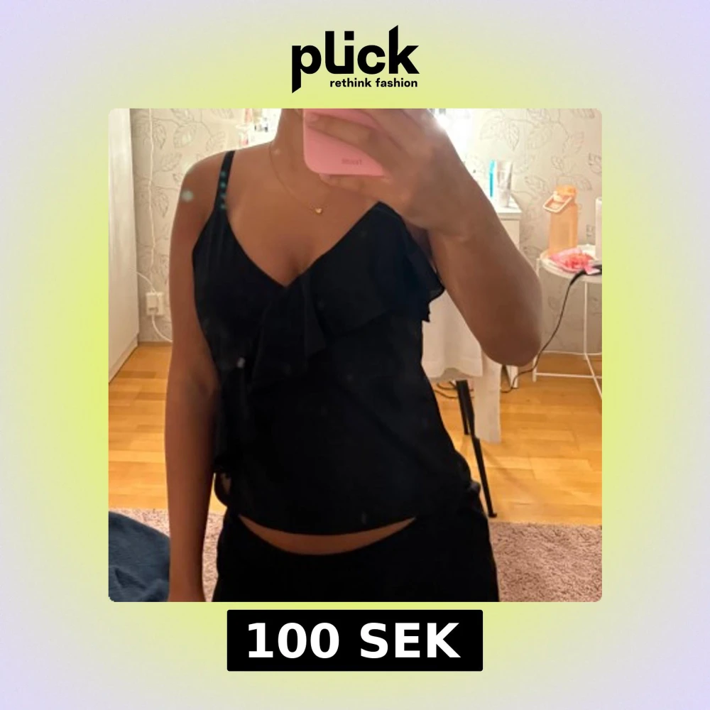 Superfint svart linne från h&m med en fin volang. Jätte skönt och går att fixa banden längre eller kortare för rätt passform. Storlek S!