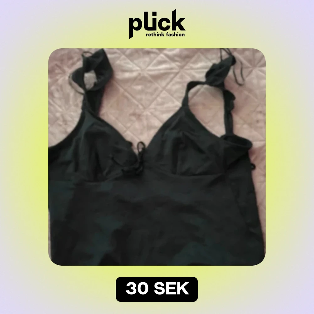 Ett svart linne med knytband och volangdetaljer. Linnet har en öppen rygg och ett av banden har gått sönder men går enkelt att sy in då de bara är en sida den lossnat från.