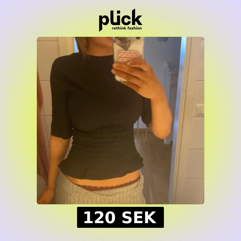 Säljer en svart ribbad topp med trekvartsärm och volangdetalj i nederkant. Perfekt för en stilren look.