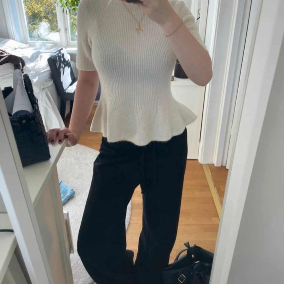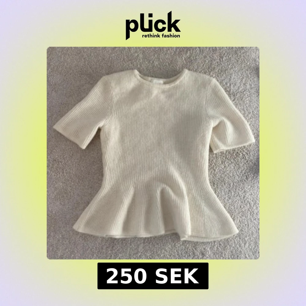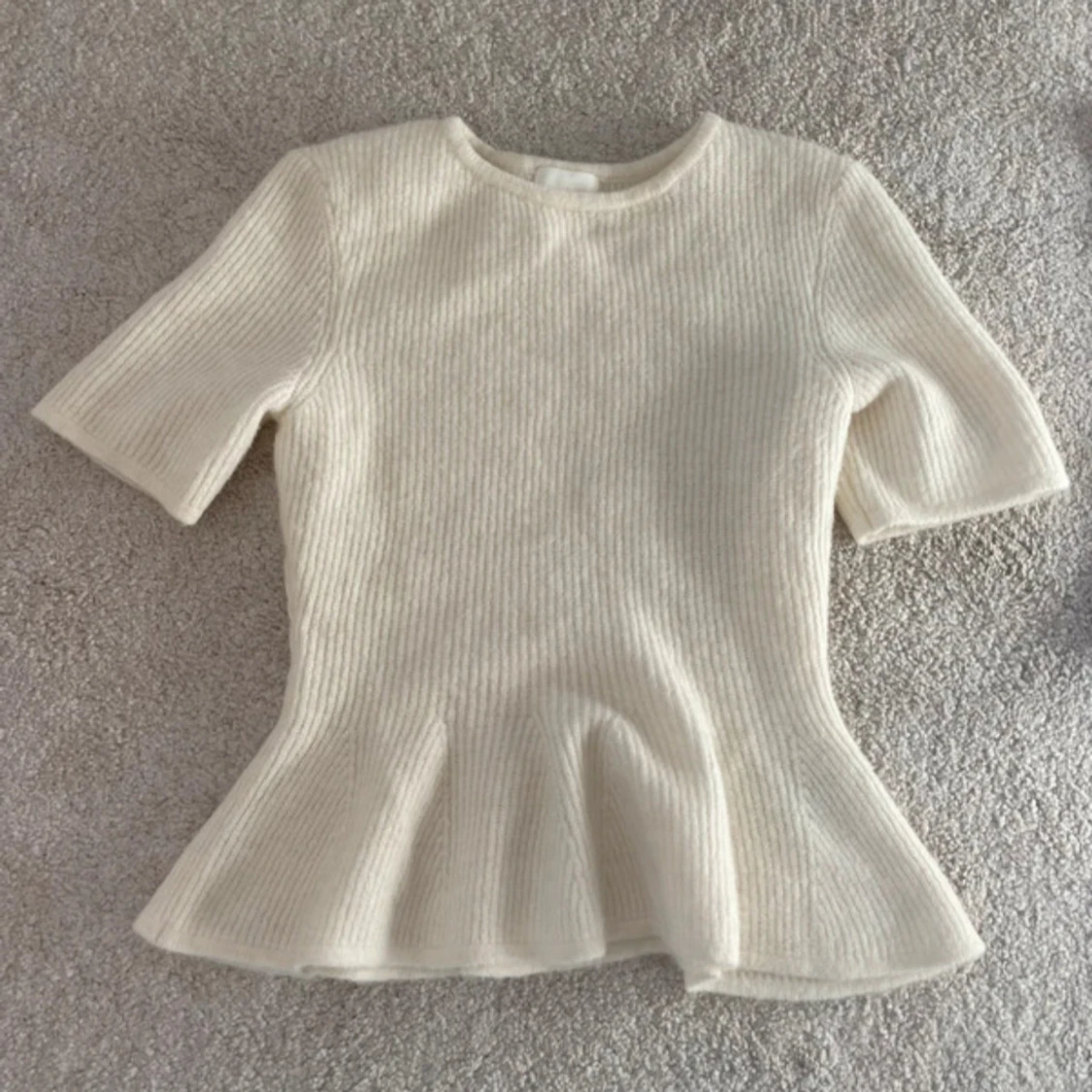 Säljer en ribbad vit stickad topp med peplumvolang nedtill och korta ärmar. Toppen har rund halsringning och är figurnära upptill med en snygg utsvängd form nedtill. Perfekt för dig som gillar en feminin och trendig look.