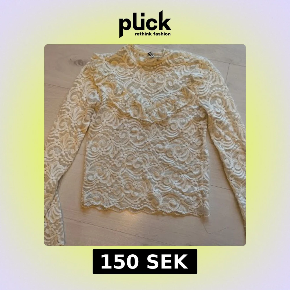 Supersnygg vit blus från H&M i genombruten spets med blommigt mönster. Långärmad modell med volangdetalj framtill och hög hals. Perfekt för dig som gillar romantisk och feminin stil. Blusen är lätt transparent och har fina vågiga kanter.