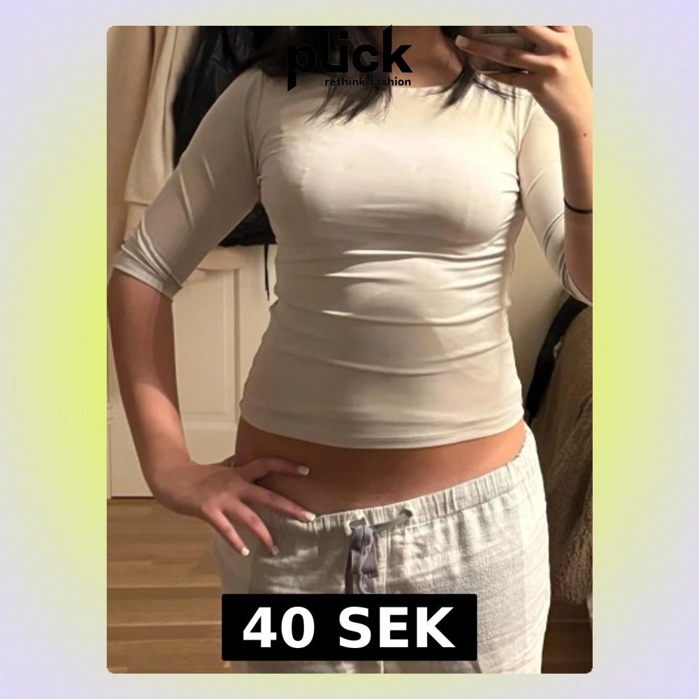 Säljer en beige, tight topp från H&M med trekvartsärm. Toppen är enkel och stilren med rund halsringning och stretchigt material som sitter snyggt mot kroppen. Perfekt att matcha med jeans eller kjol för en clean look. (Några fläckar också!)