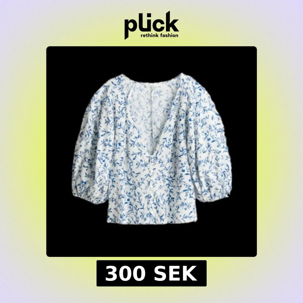 Superfin blus med blått blommönster. Djup v-ringning och stora puffärmar. Knappar framtill och lätt croppad passform. Perfekt för vår och sommar!