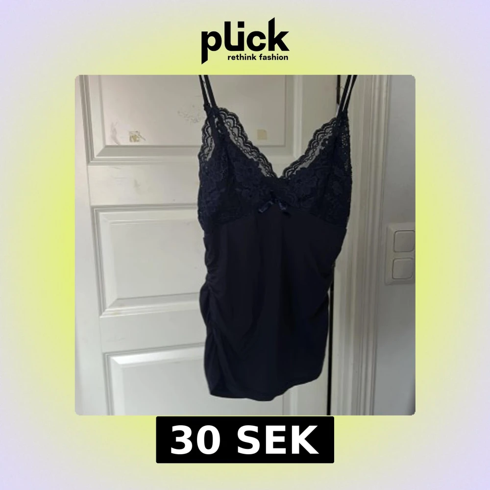 Säljer ett elegant mörkblått linne med spetsdetaljer på bysten och smala axelband. Perfekt för en stilren look.