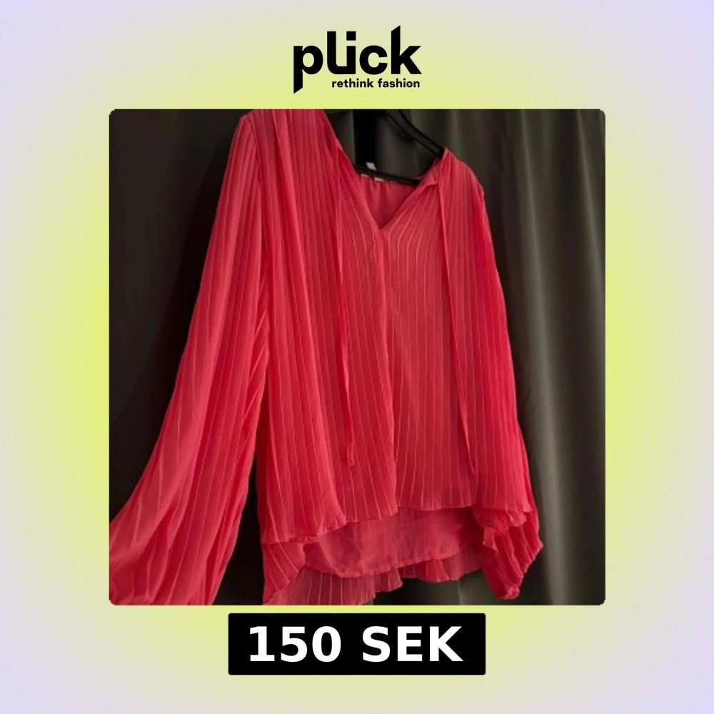 Säljer en snygg blus i stark rosa färg med v-ringning och långa, luftiga ärmar. Blusen har tunna vertikala ränder och ett flowigt, lite längre bakstycke. Perfekt för dig som gillar färg och volym i din outfit.