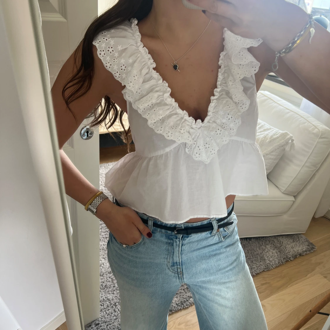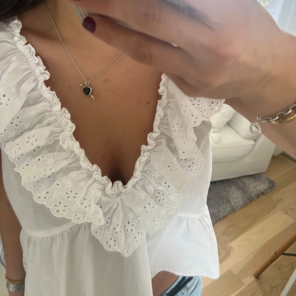 Vit volangtopp med broderade spetsdetaljer