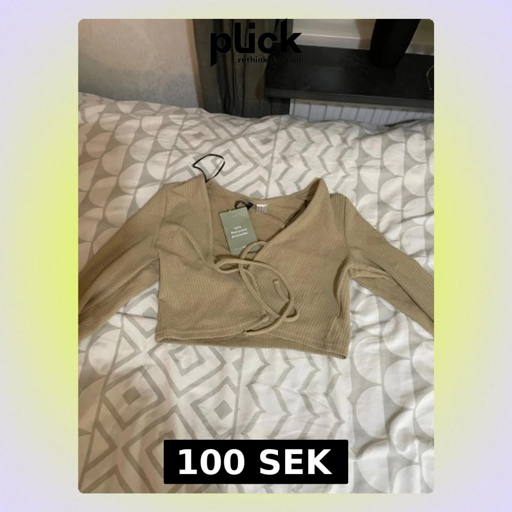 Säljer en beige croppad omlottopp från H&M i storlek S. Toppen har långa ärmar, ribbad struktur och snygg knytning framtill. Tillverkad av 52% återvunnen polyester, vilket gör den både trendig och miljövänlig. Perfekt för dig som gillar stilrena och bekväma plagg.