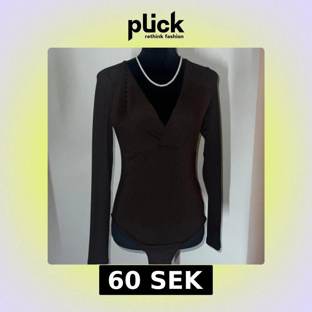 Snygg brun ribbad omlottopp med långärmad design och v-ringning. Perfekt för en stilren look.