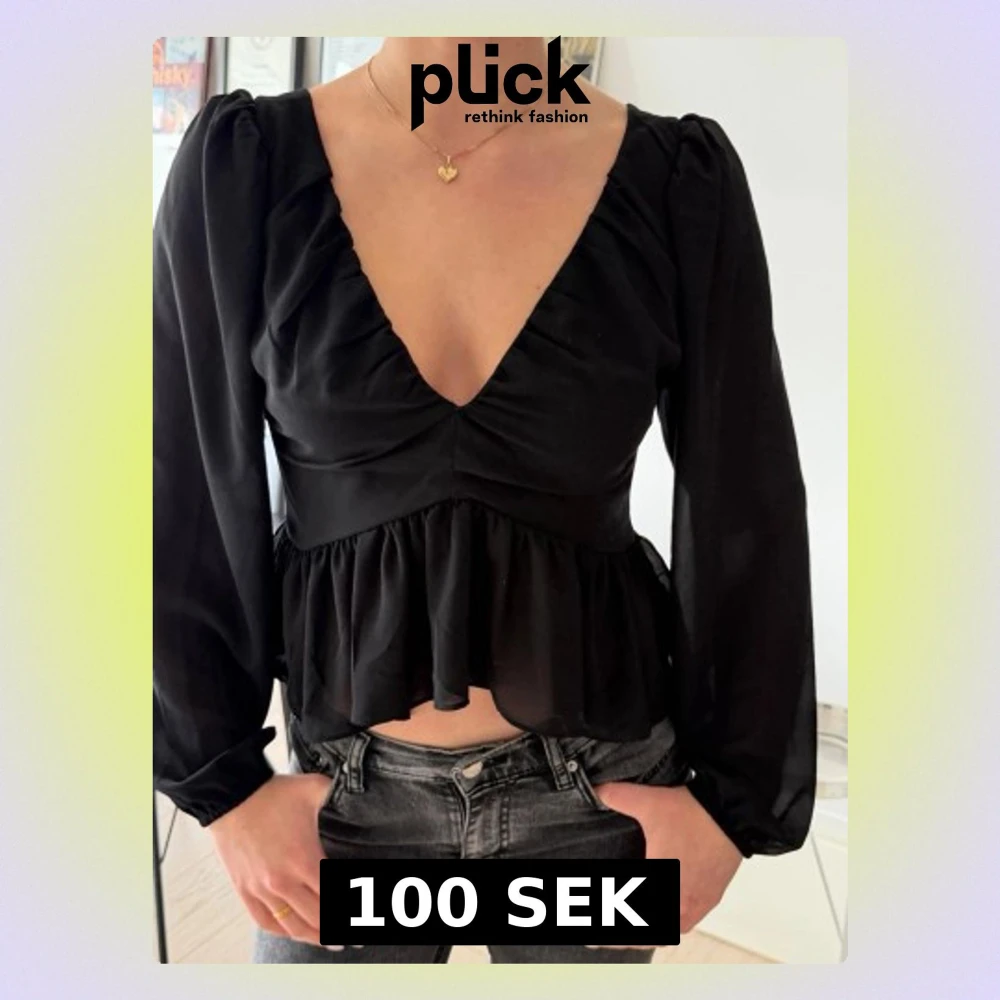 Snygg svart blus med djup v-ringning fram och öppen rygg med knytband. Långa, lätt puffade ärmar och volang nedtill ger en trendig look. Tillverkad i ett tunt, lätt material som faller fint😍
